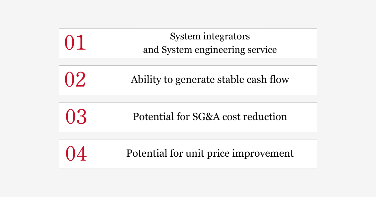 | Investment criteria | System integrators and system engineering service providers based in Japan |